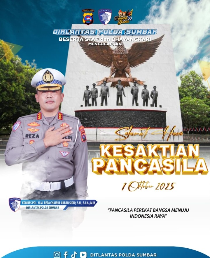 Momentum peringatan Hari Kesaktian Pancasila setiap 1 Oktober selalu menjadi pengingat betapa pentingnya Pancasila sebagai dasar negara, ideologi pemersatu, sekaligus sumber nilai luhur bangsa Indonesia. Tahun ini, jajaran Direktorat Lalu Lintas (Ditlantas) Polda Sumatera Barat di bawah komando Kombes Pol. H.M. Reza Chairul Akbar Sidiq, S.H., S.I.K., M.H. mengajak seluruh lapisan masyarakat untuk kembali meneguhkan komitmen mengamalkan nilai-nilai Pancasila dalam kehidupan sehari-hari.