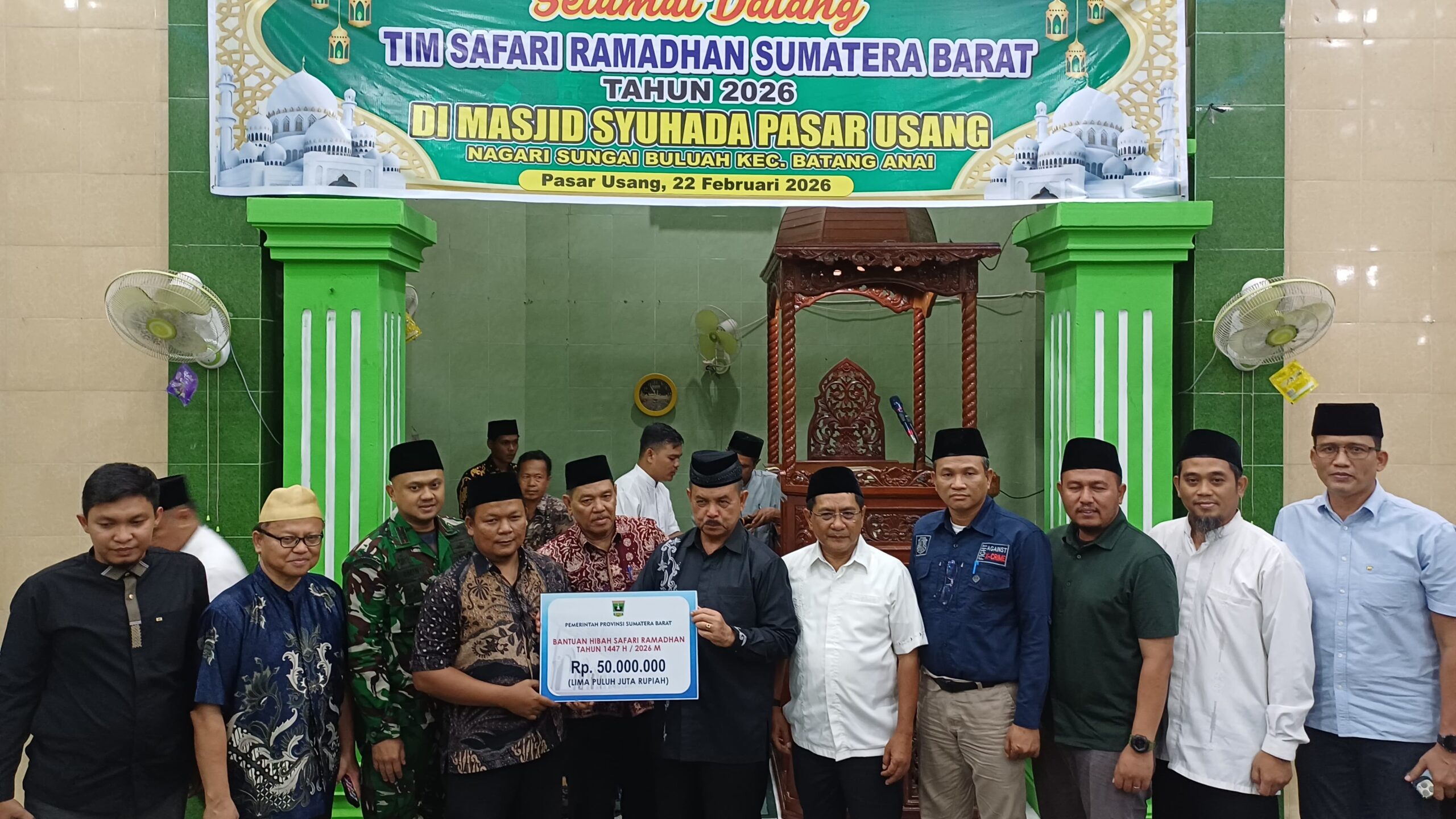 PD. PARIAMAN | Suasana khidmat dan penuh kehangatan menyelimuti Masjid Syuhada, Kecamatan Batang Anai, saat Tim Safari Ramadan Pemerintah Provinsi Sumatera Barat hadir bersilaturahmi bersama masyarakat. Kunjungan tersebut disambut langsung oleh Bupati Padang Pariaman John Kenedy Azis bersama jajaran pemerintah daerah, tokoh masyarakat, dan jamaah yang memadati masjid.