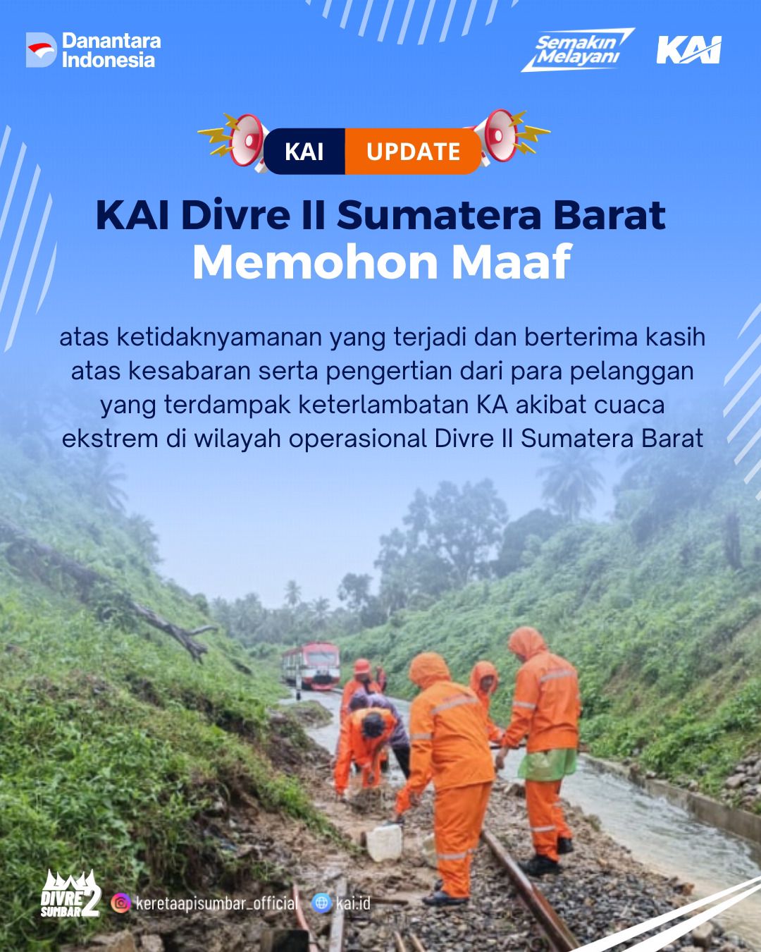 Kepala Humas KAI Divre II Sumbar, Reza Shahab, menyampaikan permohonan maaf kepada pelanggan atas gangguan yang terjadi. Ia menegaskan bahwa keselamatan tetap menjadi pertimbangan utama perusahaan dalam situasi cuaca ekstrem seperti saat ini.