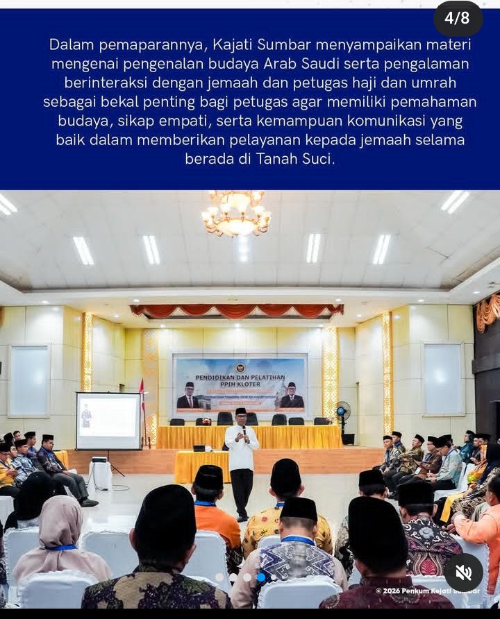 SUMBAR | Kepala Kejaksaan Tinggi Sumatera Barat, Muhibuddin, tampil sebagai narasumber utama dalam kegiatan Pendidikan dan Pelatihan Panitia Penyelenggara Ibadah Haji PPIH Kloter Embarkasi Padang Tahun 1447 Hijriah atau 2026 Masehi. Kehadiran Kajati Sumbar ini menjadi bagian penting dalam penguatan kualitas sumber daya manusia petugas haji yang akan bertugas melayani jemaah di Tanah Suci.