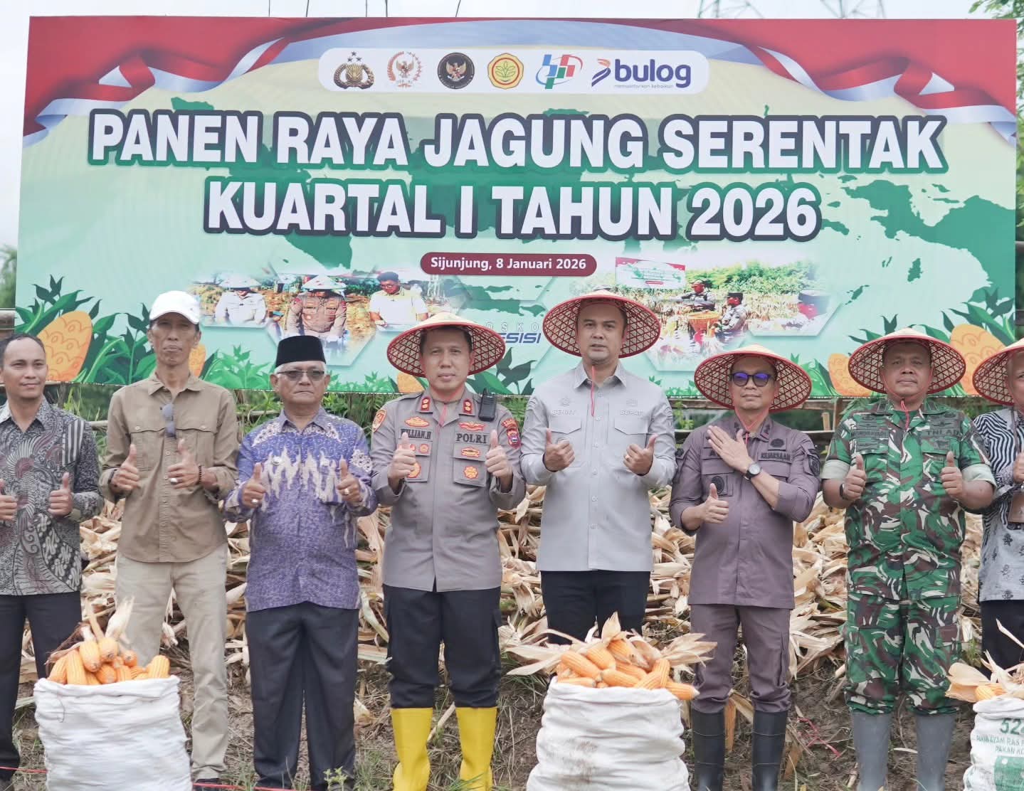 SIJUNJUNG | Hamparan ladang jagung yang menguning di Jorong Padang Ranah, Nagari Sijunjung, menjadi saksi bagaimana isu besar ketahanan pangan nasional diterjemahkan dalam tindakan nyata di daerah. Kamis (8/1/2026), Kapolres Sijunjung AKBP Willian Harbensyah, S.I.K., M.H., turun langsung ke ladang dalam kegiatan Panen Raya Jagung Serentak Kuartal I Tahun 2026, sebuah momentum strategis yang menegaskan keterlibatan aktif Polri dalam menjaga masa depan pangan negeri.