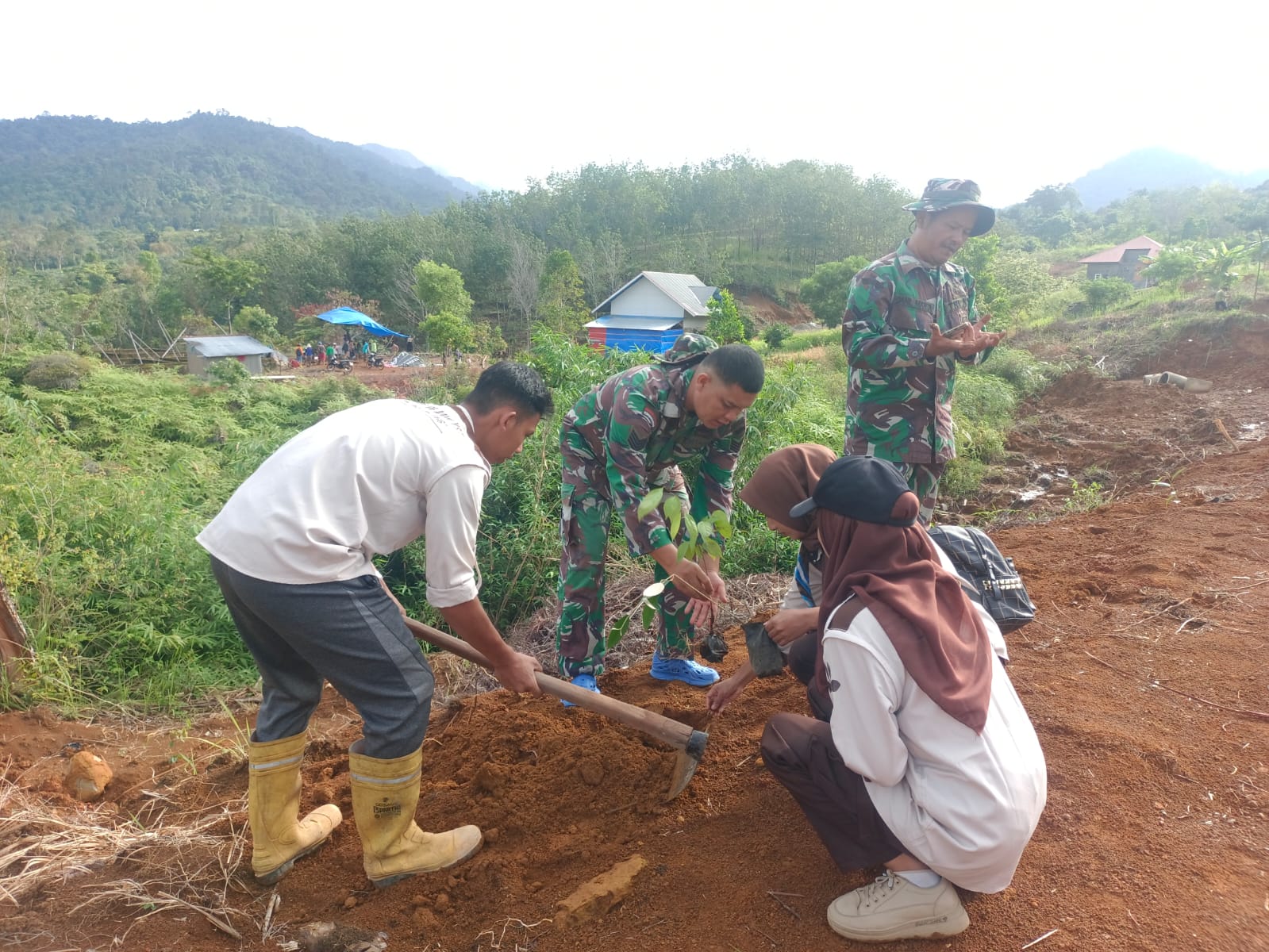 Pelda Andi Irawansyah terlihat turun langsung ke lapangan bersama masyarakat, memimpin proses penanaman pohon mulai dari penggalian tanah hingga penanaman bibit secara bersama-sama dengan penuh semangat kebersamaan.