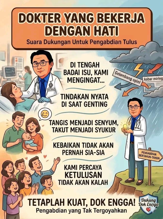 Dokter Engga, mungkin hari ini langkah terasa lebih berat, suara-suara terasa lebih bising, dan tudingan terasa lebih tajam. Tapi percayalah, di balik semua itu, ada banyak hati yang diam-diam mendoakan, ada banyak keluarga yang menyimpan rasa terima kasih yang tidak akan pernah hilang.