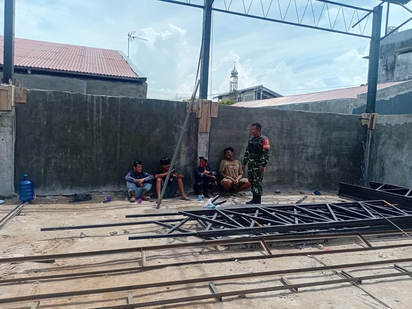 Serka Roby Kurniawan terlihat aktif berinteraksi dengan para pekerja dan warga sekitar, memastikan setiap tahapan pembangunan berjalan sesuai rencana dan tetap memperhatikan aspek keselamatan serta kualitas pekerjaan di lapangan.